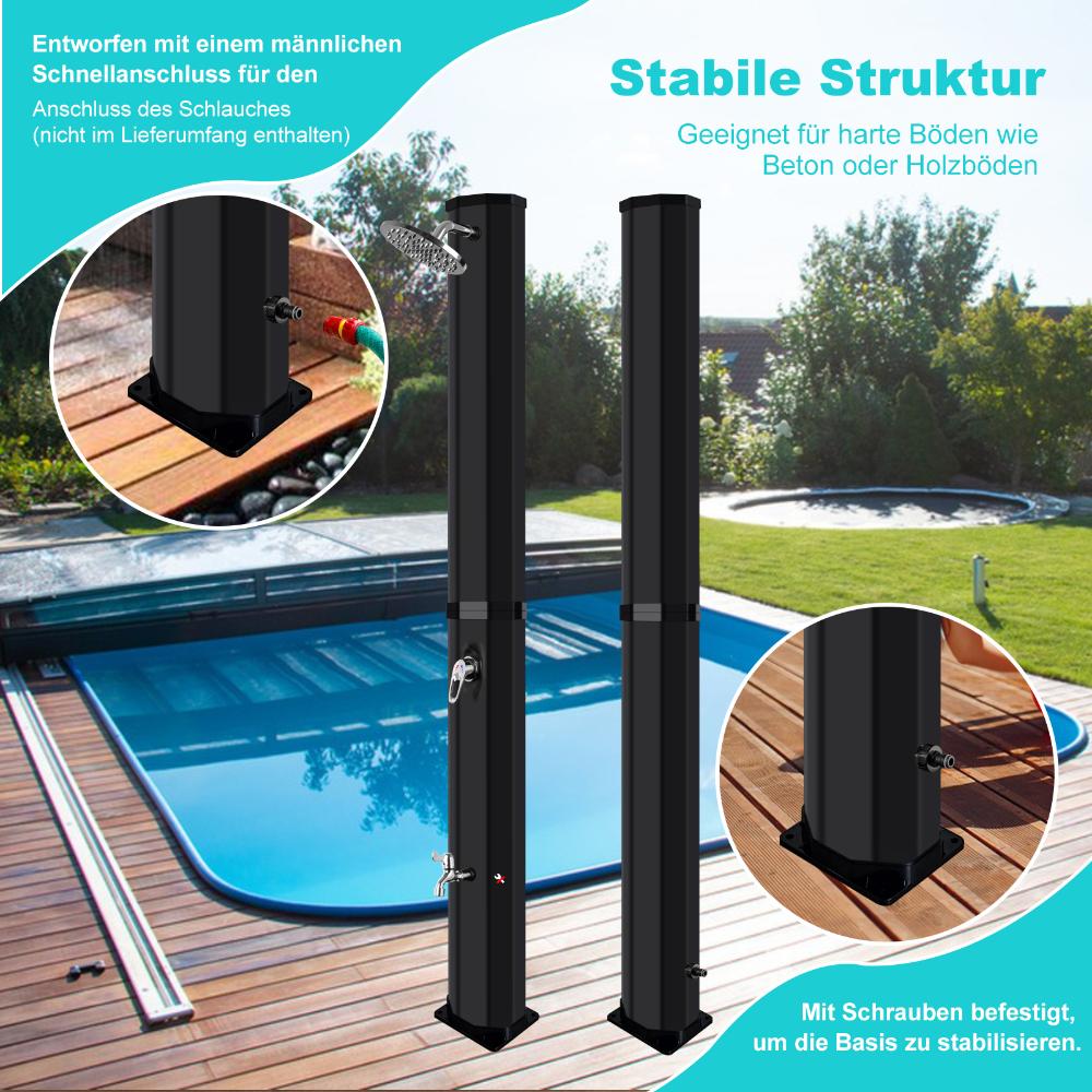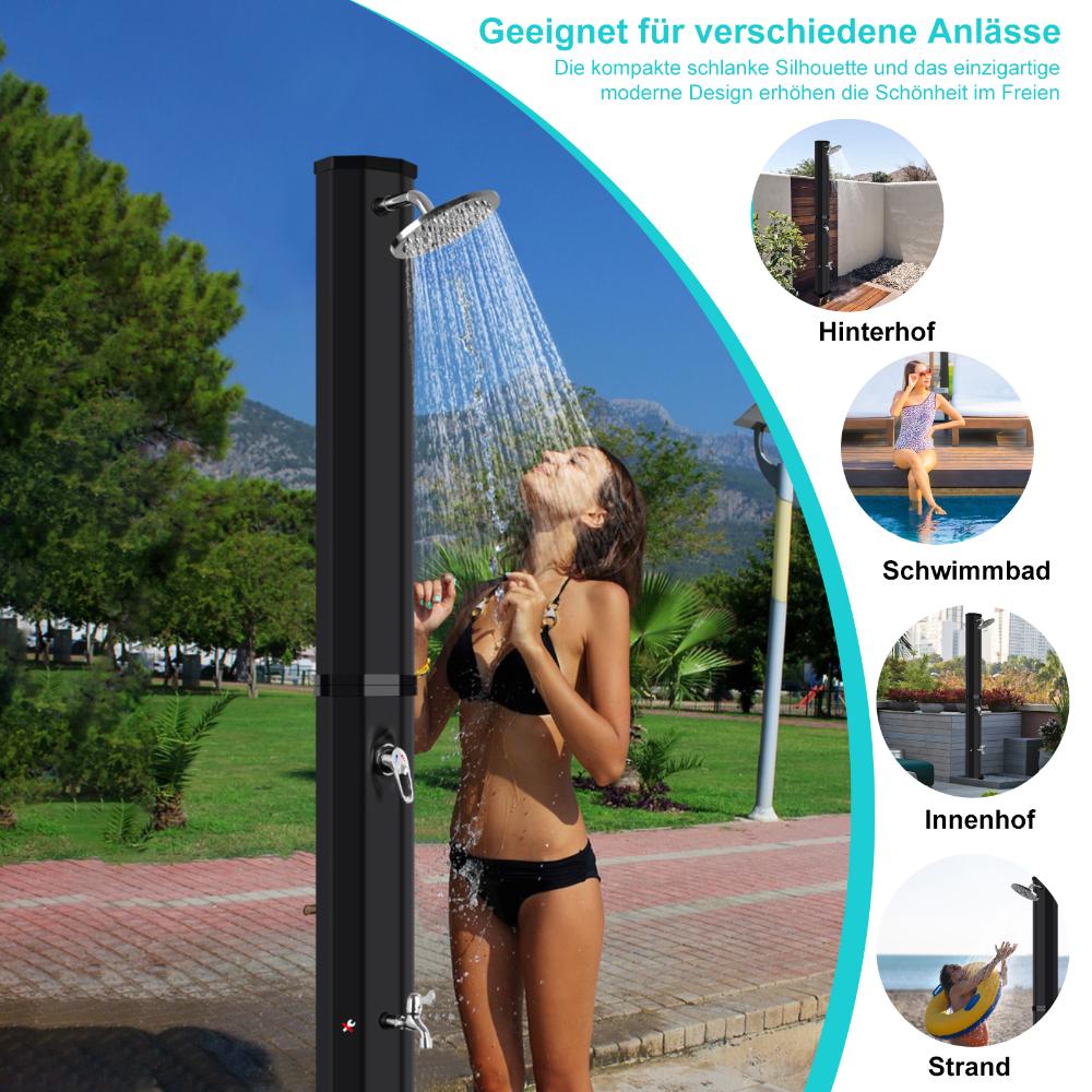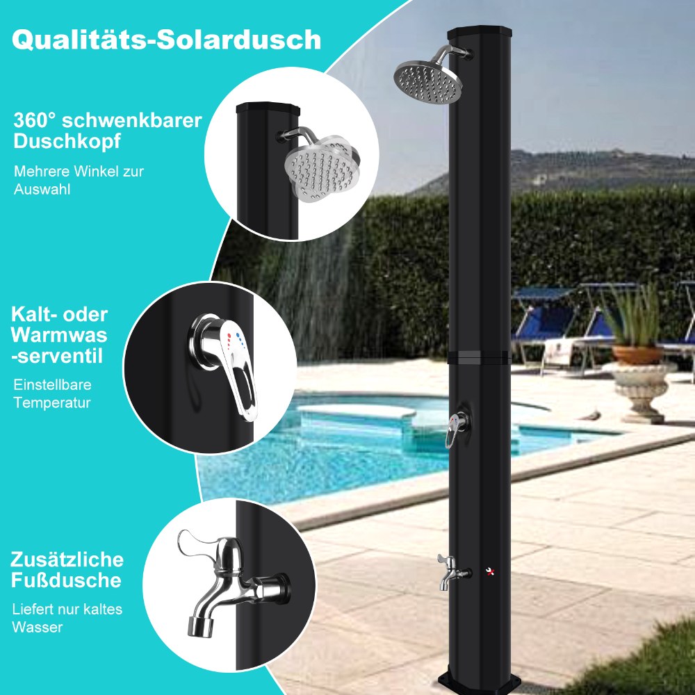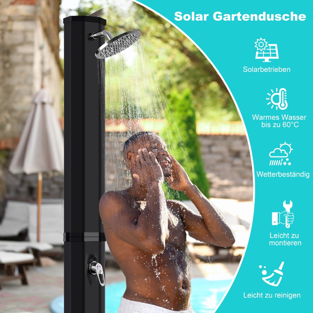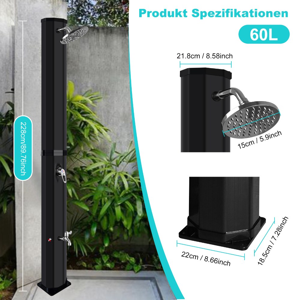 【Instant hot water thanks to solar energy】 The solar shower automatically heats the water to up to 60°C – completely electricity-free and cost-saving. Perfect for families, camping enthusiasts or gardening lovers. 【Flexible use with 360° shower head & adjustable pressure】 The adjustable tap and swivel shower head allow for individual temperature and pressure settings. Ideal for use as a pool shower, garden shower or camping shower 【Large capacity & winter-proof tank】 Choose between 35L, 40L or 60L! The UV-resistant PVC-ABS tank can withstand extreme temperatures and is scratch-resistant for long-term use. 【Robust construction for outdoor use】 Thanks to 4 screw fastenings and weatherproof materials, the solar shower remains stable even on concrete surfaces or uneven ground. Ideal for gardens, construction sites or animal care 【Multifunctional & easy to install】 Use the solar shower as a mobile outdoor shower, pool shower or camping shower – installation takes only 5 minutes!