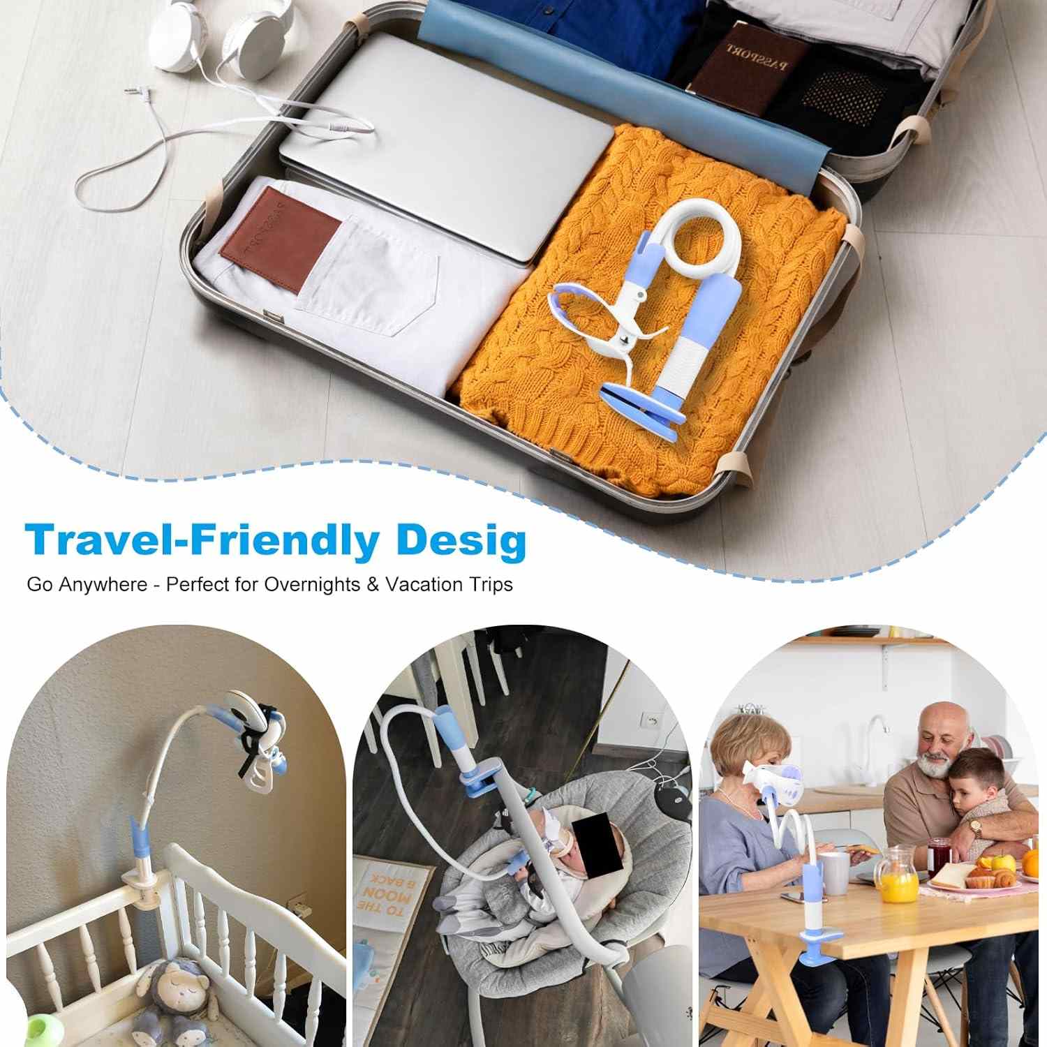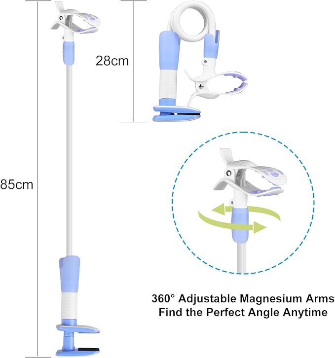 Universal 360° monitoring: This universal baby monitor mount fits all cradles, beds and furniture (max. thickness 6.5 cm). Position the camera 360° adjustable for optimal viewing of your baby day and night, even when they turn over. Double arm made of durable magnesium alloy: thick structure for stability + thin arm for a precise fit. Total length 85 cm, foldable to 28 x 20 x 5 cm for storage/transport. Compatible with 90% of models on the market. Complete safety & 24-hour monitoring: Designed with non-tip materials and a wide base to prevent falls. Ideal for continuous monitoring, even during sleep, without risk of strangulation (cable secured with Velcro straps). Installation without drilling in 1 minute: Sturdy clamp with non-slip silicone pads (grips up to 5 cm thick). No tools or damage to furniture - ideal for rented flats or delicate children's rooms. Portable & versatile: Quick disassembly for travel or overnight stays. Can also be used as a phone/TV stand on tables, beds or shelves.