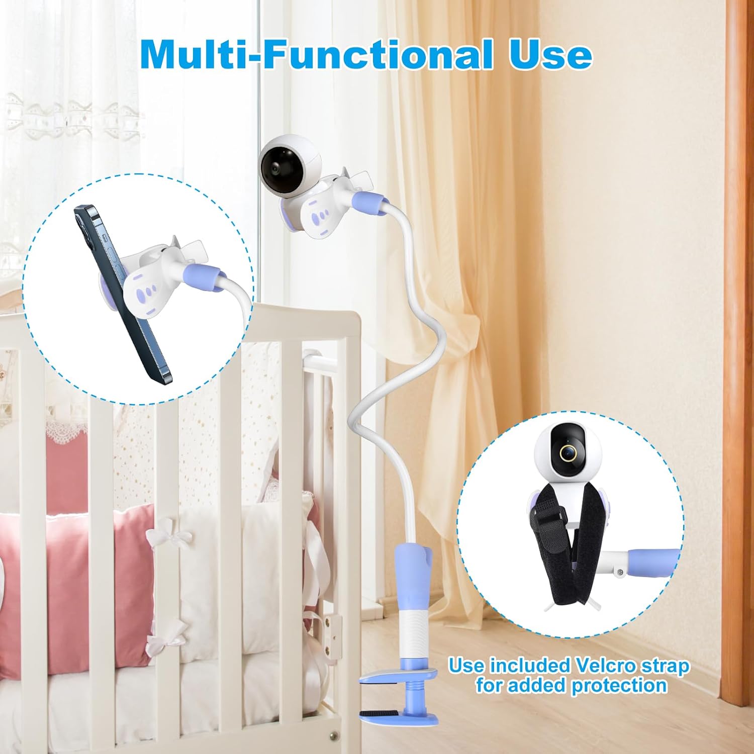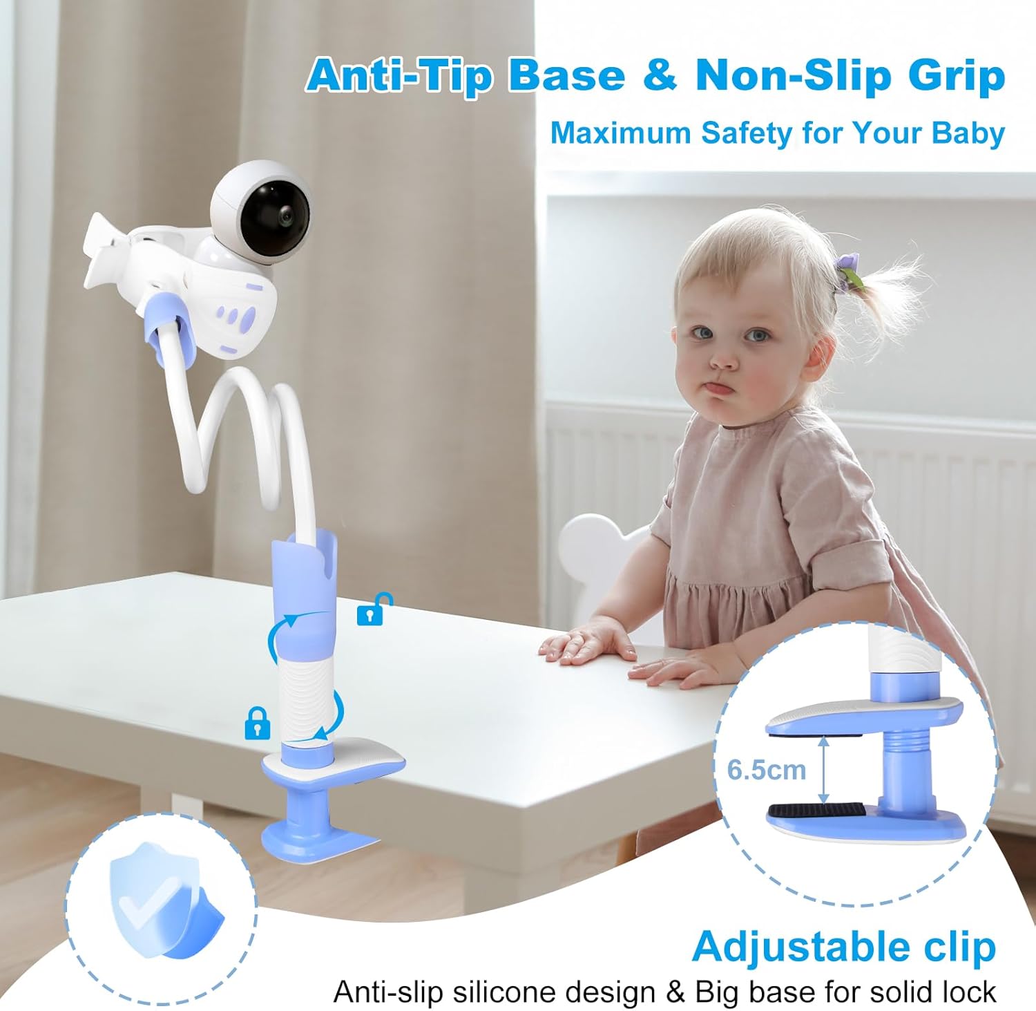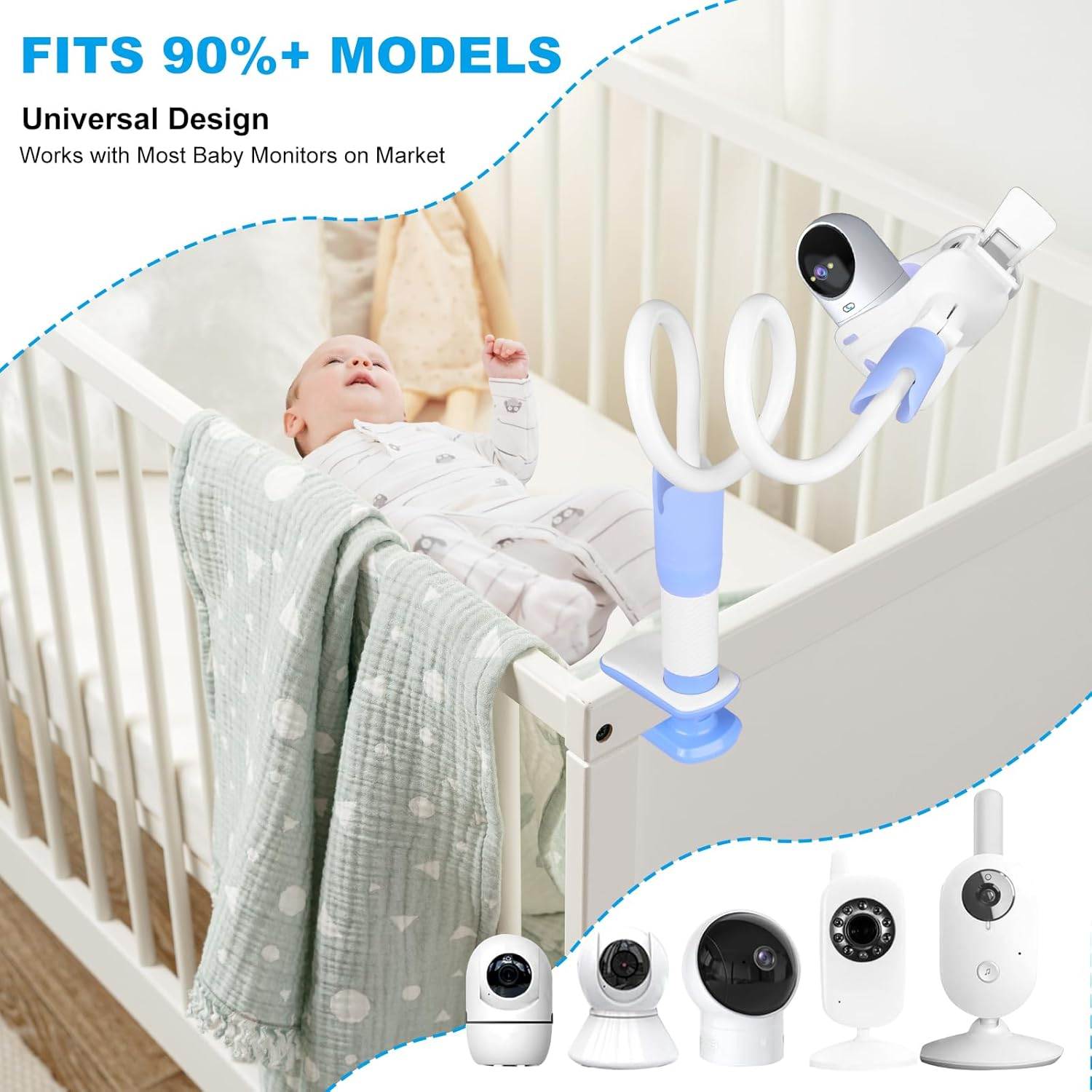 Universal camera mount for babies – flexible double arm, 360°, installation without drilling, compatible with video monitors and furniture
